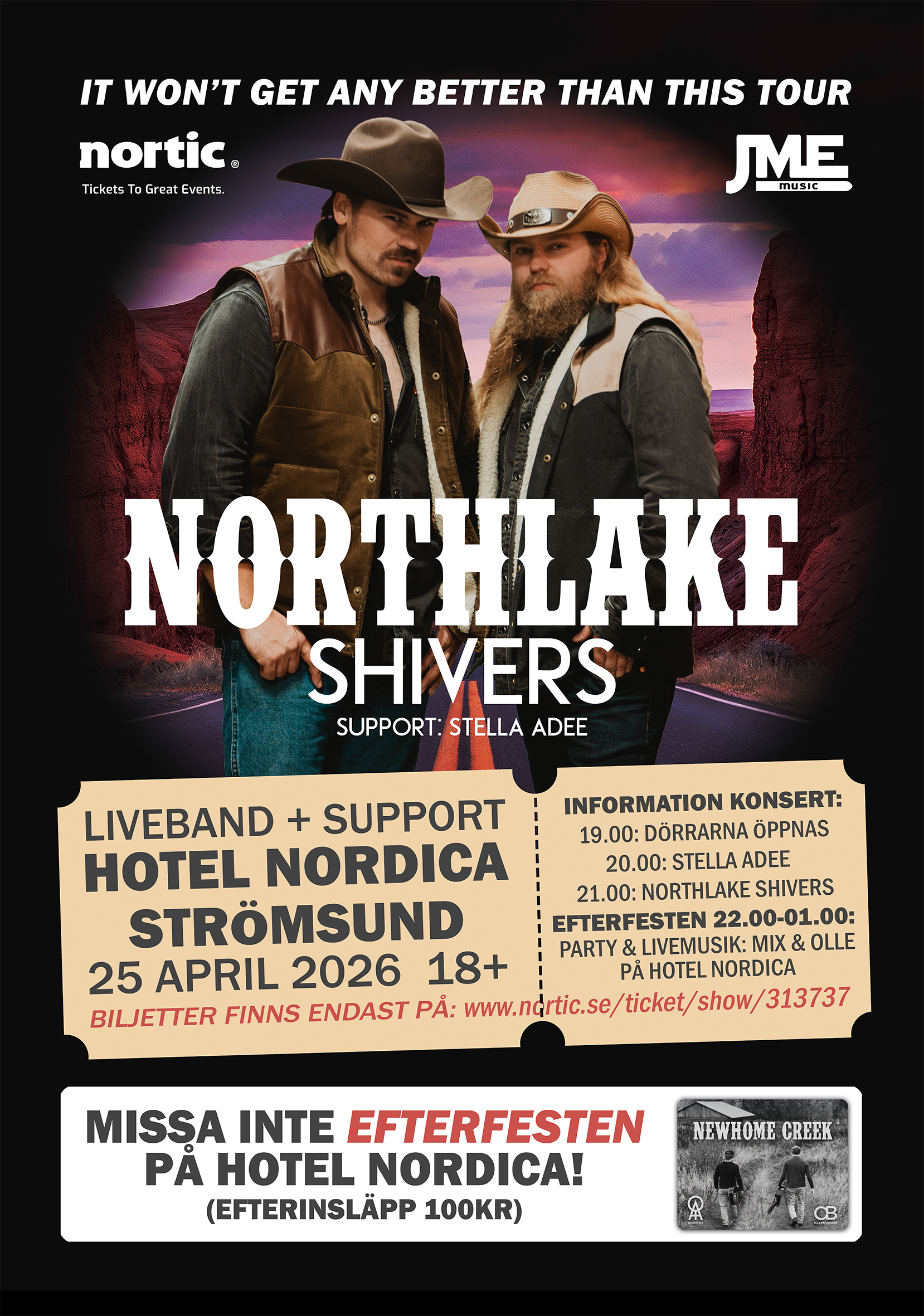 25 april spelar dom på Hotel Nordica i Strömsund med support Stella Adee. Hotel Nordica är medarrangör och har både Förfesten 18.00-20.00 med grillbuffé och underhållning, för de som köpt biljetter genom Nortic. Efterfesten med både party och underhållning: Newhome Creek (Mix & Olle).